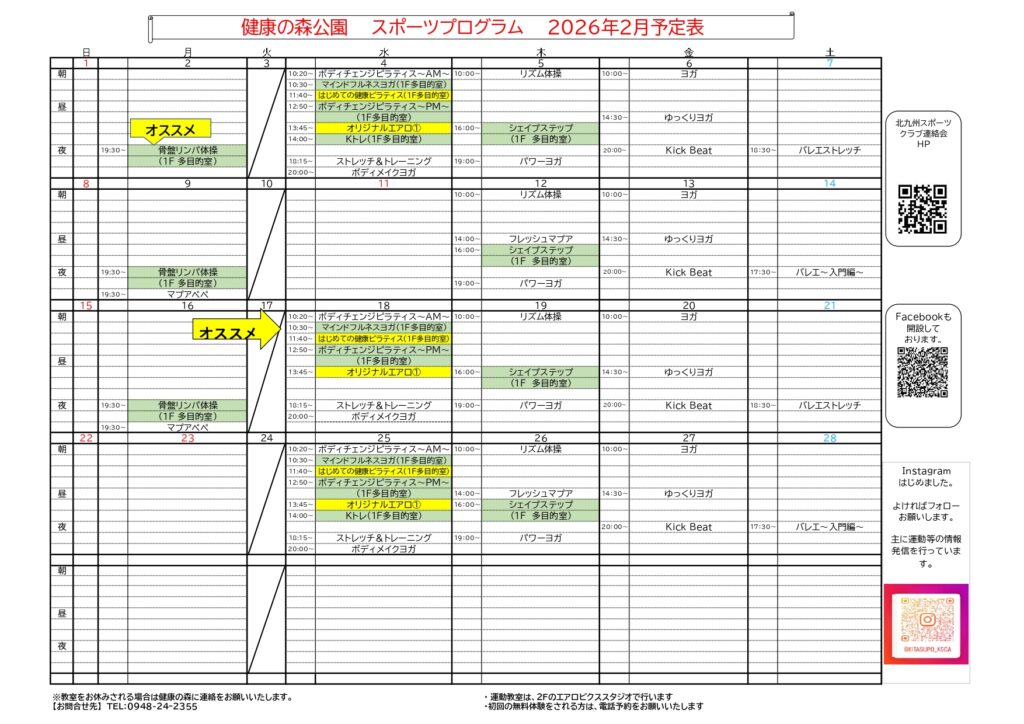 2026年2月 健康の森 運動教室のスケジュールになります。